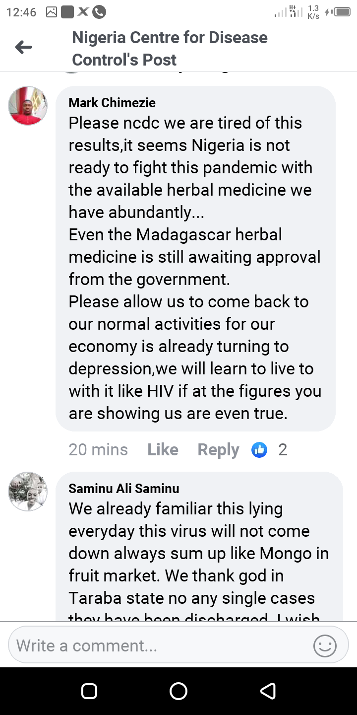Though to so many, going by the number of comments expressing scepticism over the figures been released on a daily basis, Nigerians are sadly having the very popular opinion that the figures are false. While some believes that there is Corona virus but the figures aren't correct, some others don't believe in the existence at all.