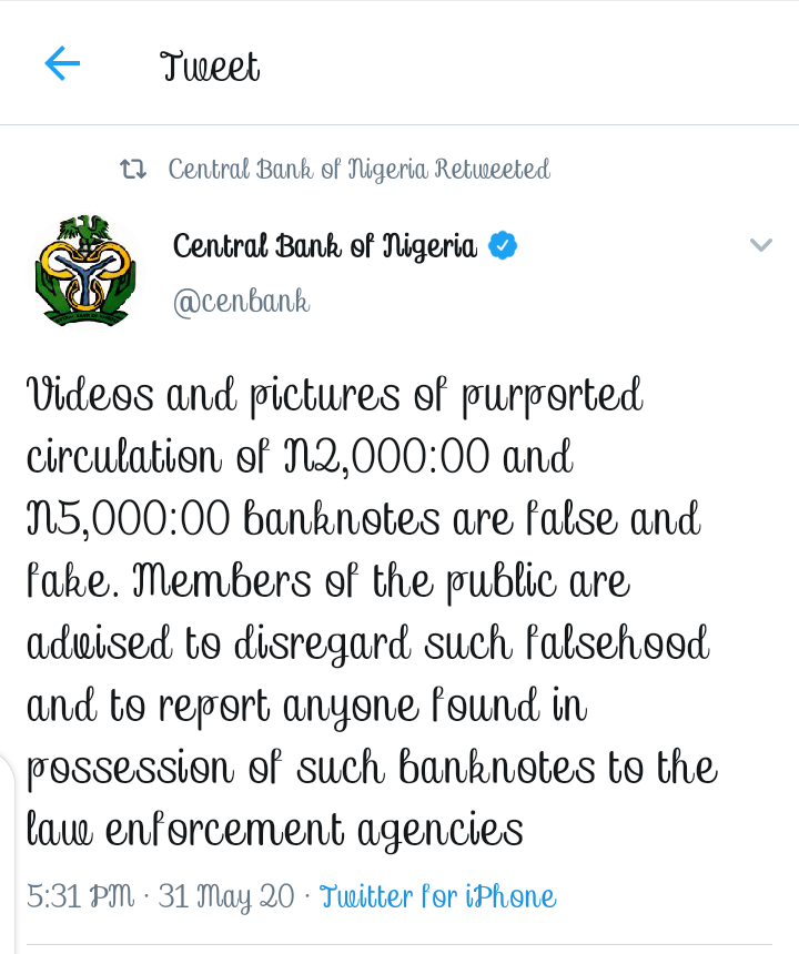 The post read: "Recordings and pictures of indicated dissemination of N2,000:00 and N5,000:00 banknotes are bogus and counterfeit."