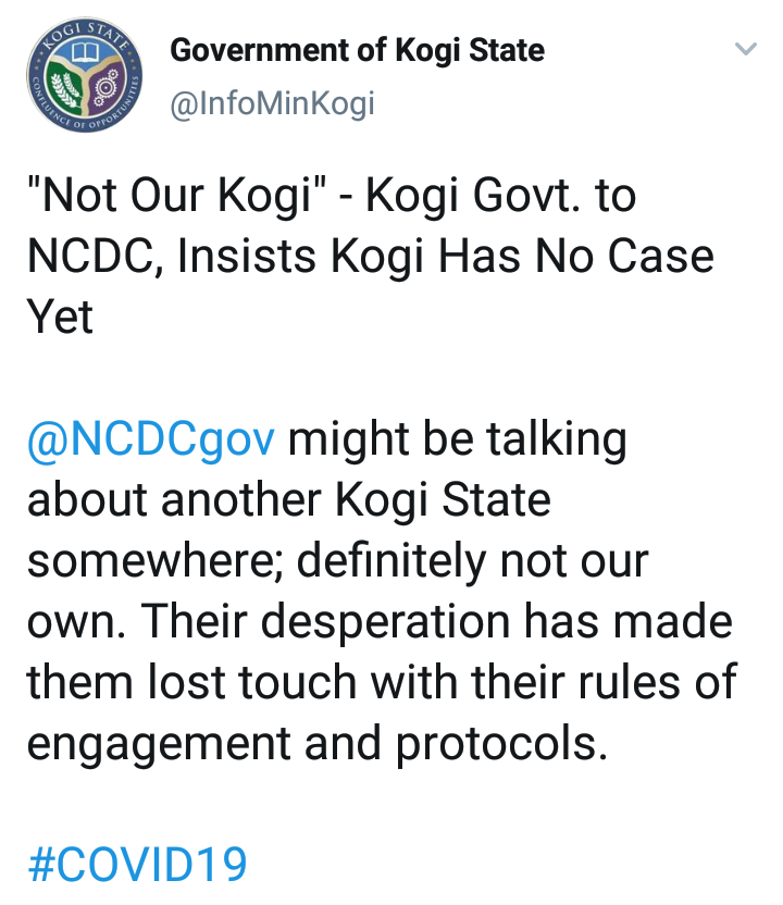 "NCDC might be talking about another Kogi State somewhere; definitely not our own. Their desperation has made them lost touch with their rules of engagement and protocols.