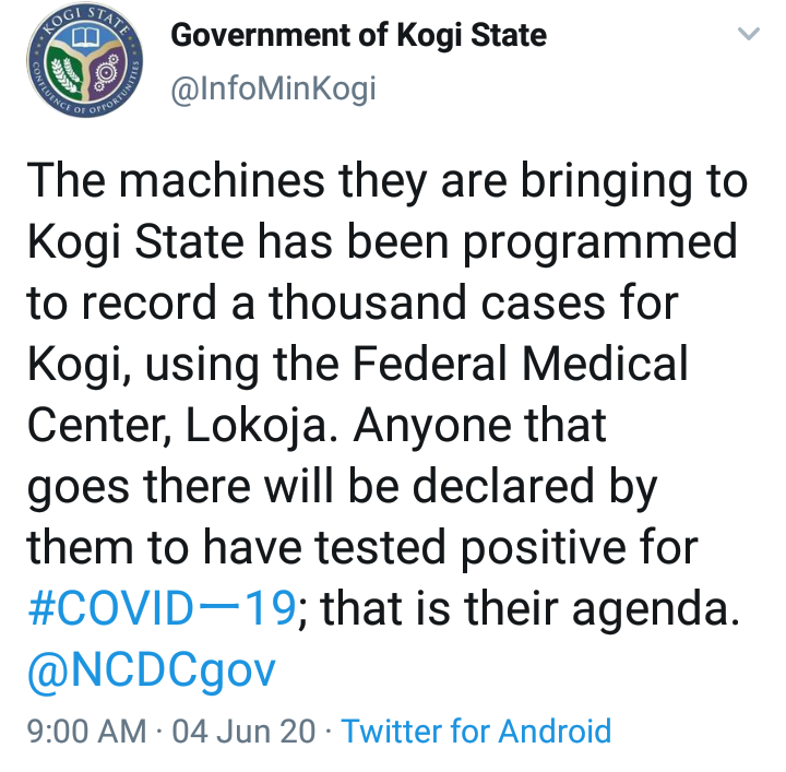 "The machines they are bringing to Kogi State has been programmed to record a thousand cases for Kogi, using the Federal Medical Center, Lokoja. Anyone that goes there will be declared by them to have tested positive for #COVIDー19; that is their agenda".