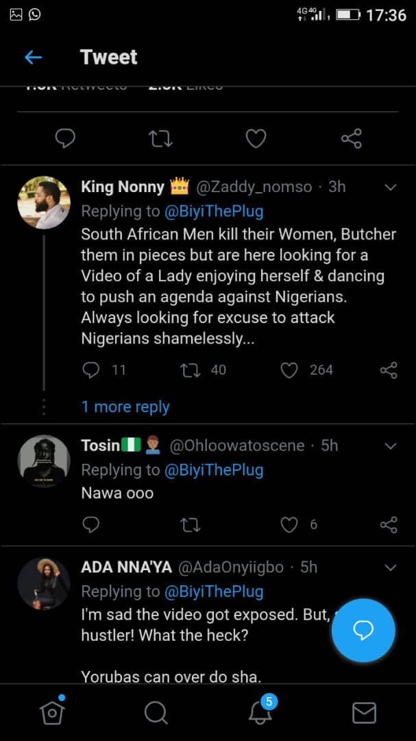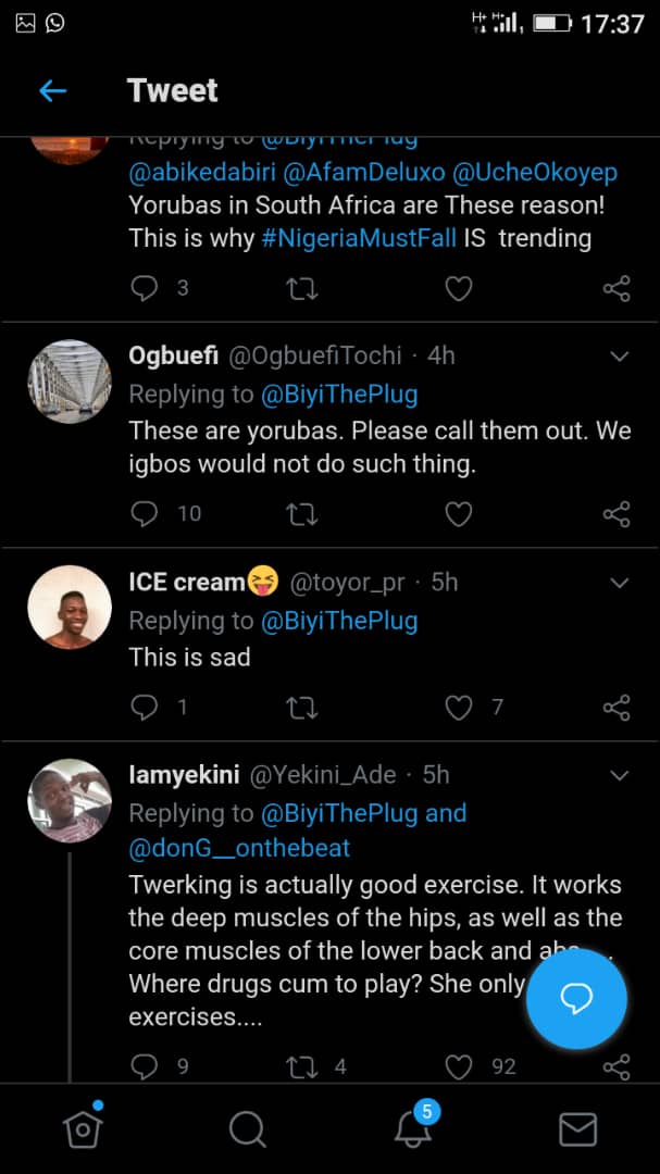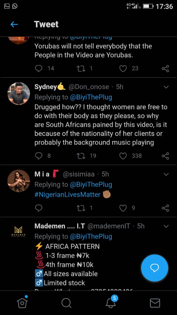 Few minutes after the video went into circulation, a hashtag on Twitter titled Nigerians must fall emerged, as many South Africans condemned Nigerians for drugging their girls and also prostituting them, stating Nigerians must leave their country.