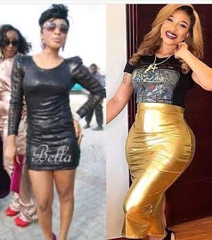 Tonto Dikeh shared a throwback photo showing her body before she had plastic surgery and a recent one taken after surgery to show her transformation.